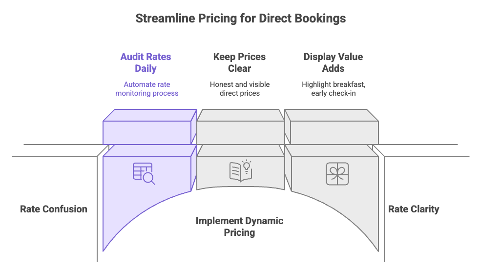 Guests see a rate on Google, a different one on the website, another on Booking.com, and a promo code that… doesn’t work. Confusion is friction. Friction kills conversion.