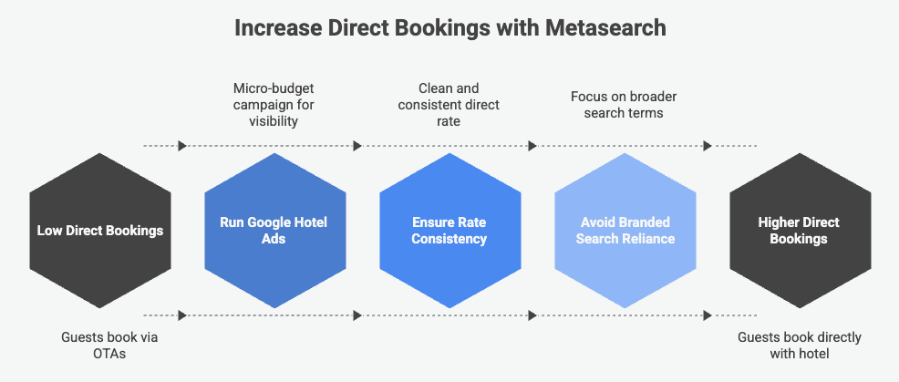 Hotels that do invest in metasearch enjoy significantly higher direct-share performance, because they appear exactly where guests are already searching. OTAs know this – that’s why they bid aggressively under your name.