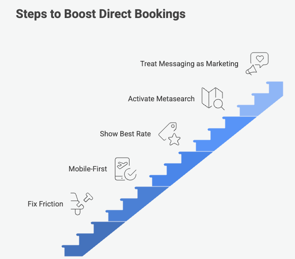Fix a friction every week. Page speed, messaging, pricing, booking flow. Direct bookings rise when obstacles fall.
